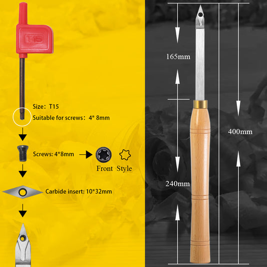 Woodturning Mid Detailer Carbide Tipped VEMN 160202 Diamond Tungsten Carbide Insert Cutter Lathe Tool Bar with Solid Wooden Handle 400mm